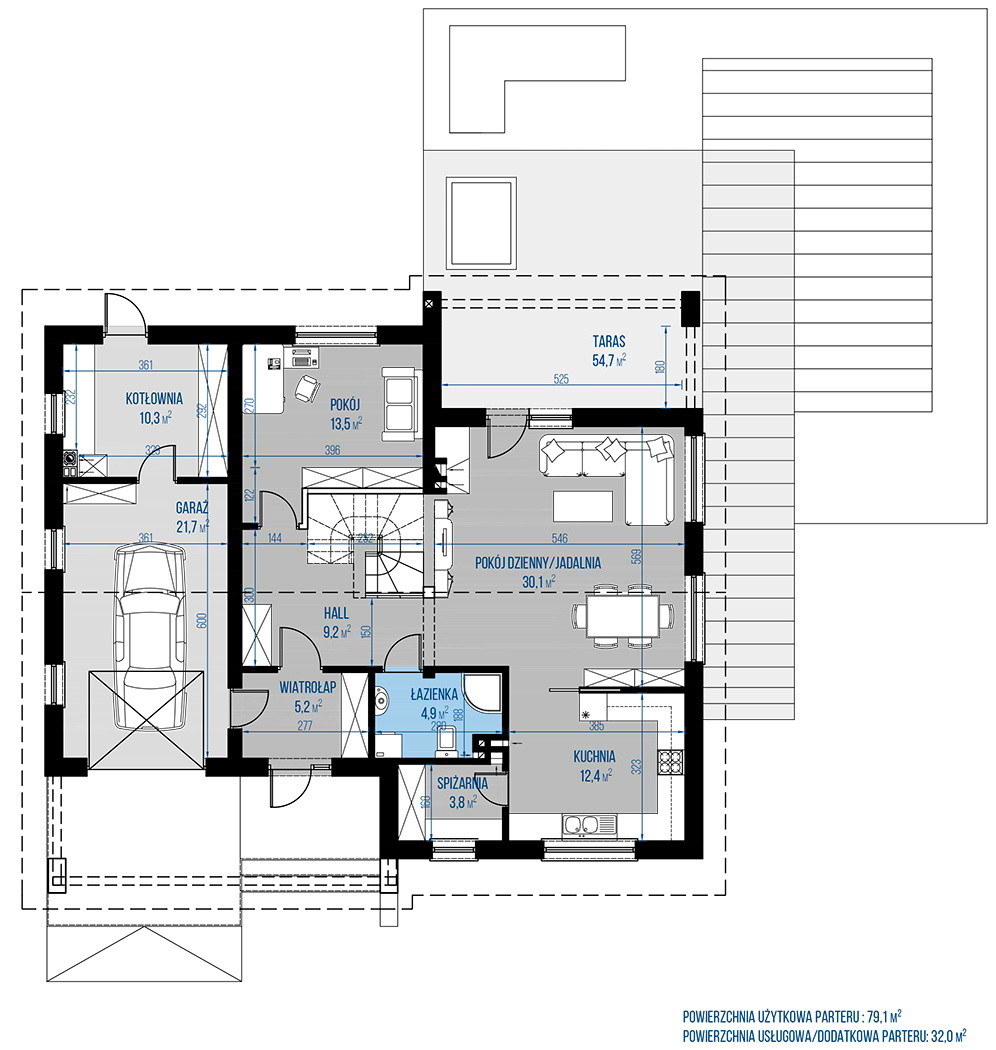 Parter domu to otwarta strefa dzienna, która obejmuje salon z jadalnią i opcją otwartej kuchni z drzwiami przesuwnymi. Przyległa spiżarnia oferuje dodatkową przestrzeń na przechowywanie. Dla osób pracujących z domu przewidziano komfortowy gabinet, a z holu dostępny jest również funkcjonalny garaż jednostanowiskowy z kotłownią i pomieszczeniem gospodarczym, z łatwym dostępem do ogrodu.